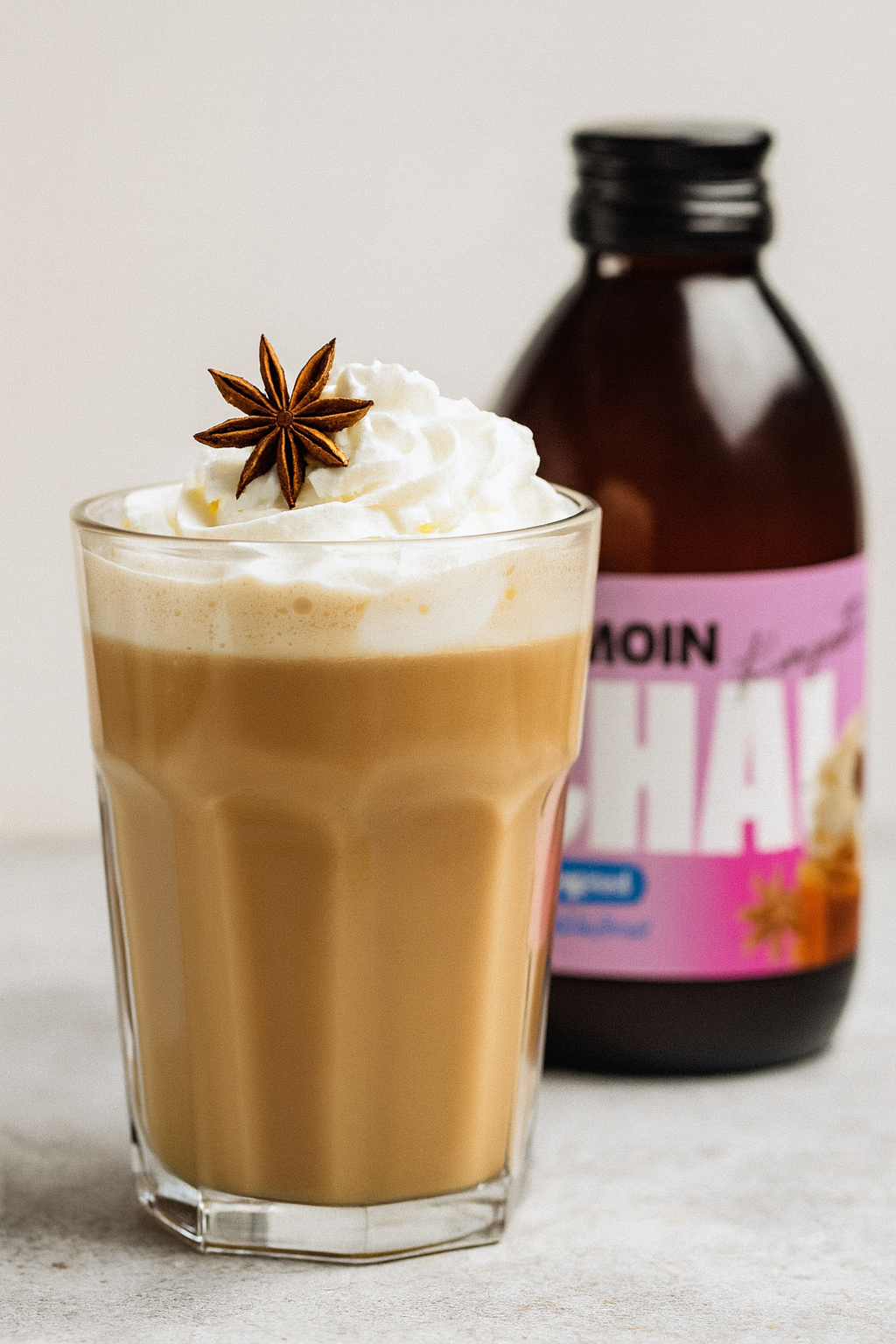 Erwärme einfach deine Milch oder Pflanzendrink, gib einen Schuss vom Moin Chai Konzentrat dazu – und schon hast du einen cremig-würzigen, heißen Chai Latte wie aus dem Coffee-Shop.