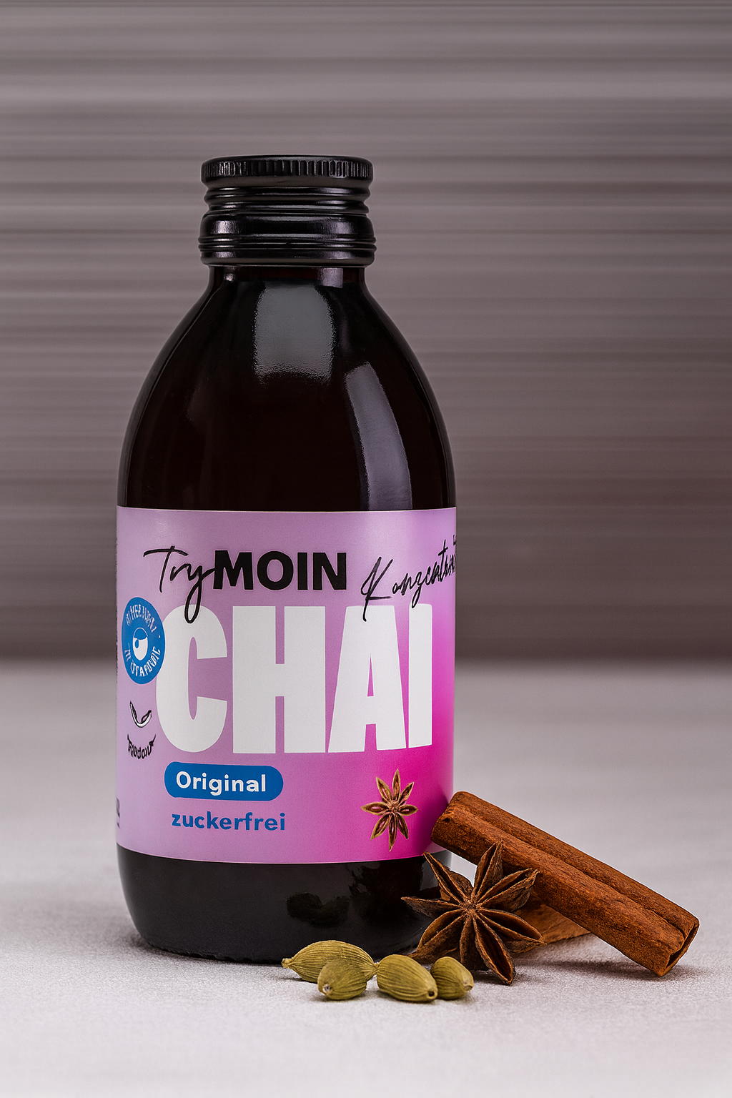 Der Chai Latte von Moin ist unser erstes Konzentrat auf Schwarztee-Basis – ganz ohne Kaffee, dafür mit echtem, würzigem Chai-Geschmack. Das erste Chai-Konzentrat seiner Art auf dem Markt!