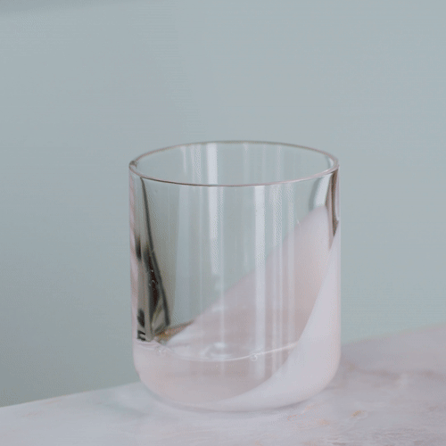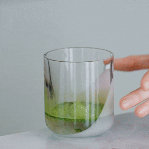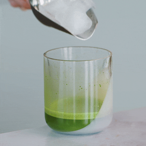 Anschließend Eiswürfel zugeben und mit 150ml (Hafer-)Milch aufgießen = perfekter Matcha Latte in Sekunden!