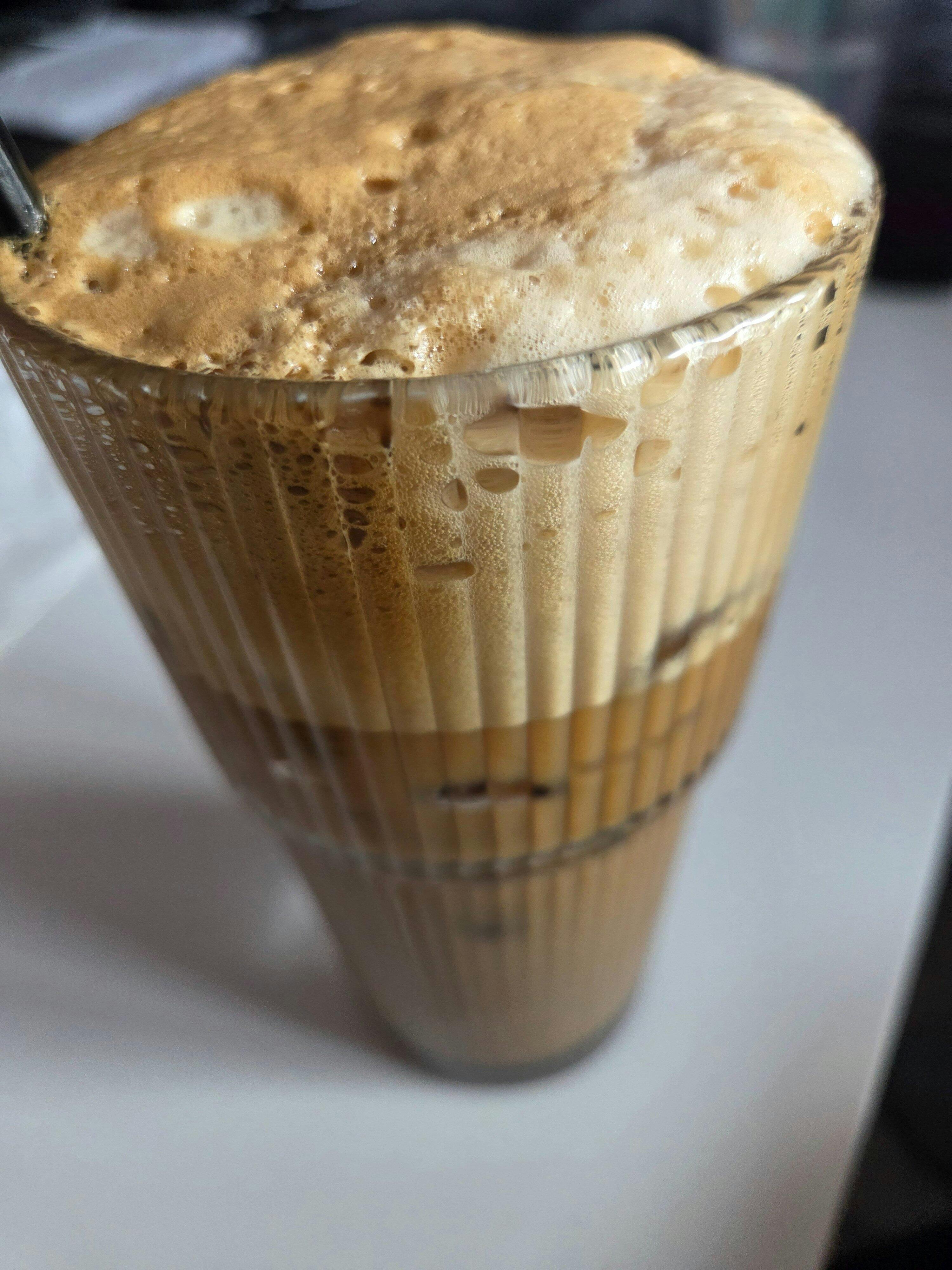 Glas mit Eiswürfeln und 200ml Milch (-alternative) füllen, 1-2 Löffel Moin dazu & genießen!